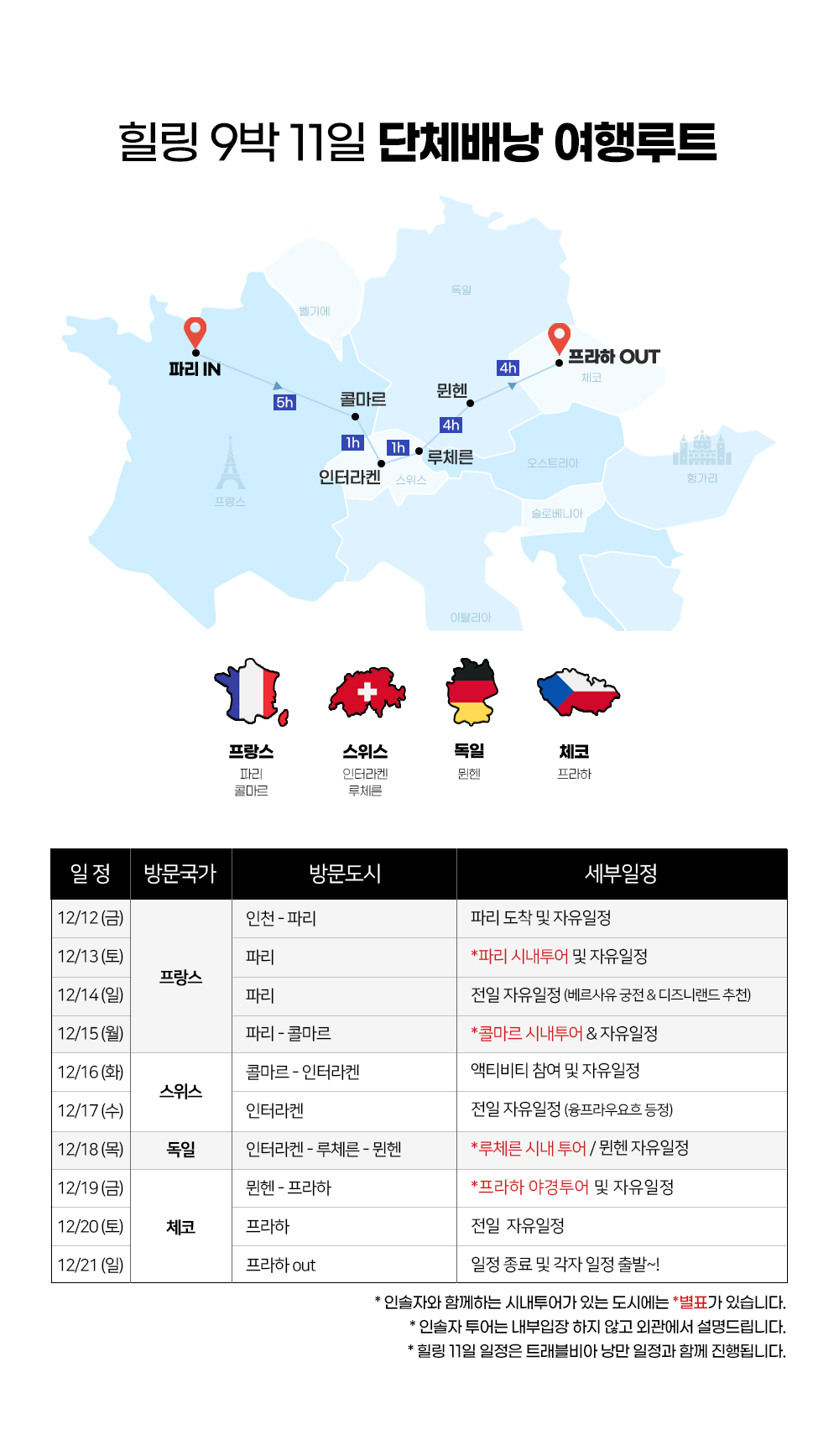 * 동·서유럽 힐링 11일 일정은 낭만 일정과 함께 진행됩니다.